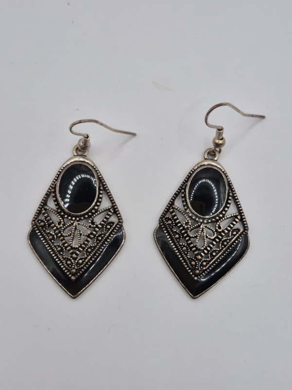 Oorhangers met zwarte steenMateriaal: zilverkleurig metaal, zwarte glassteen