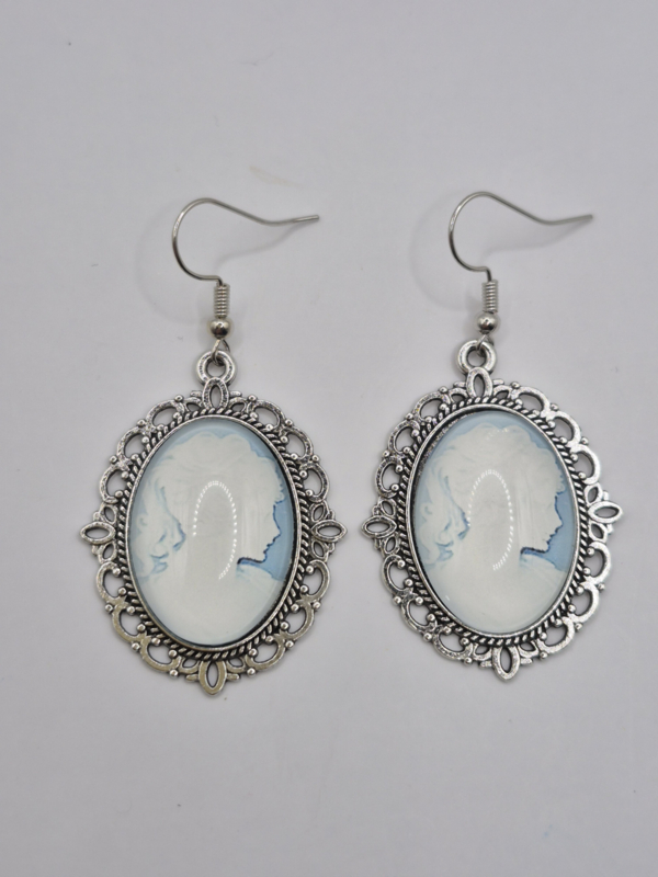 Oorbellen met afbeelding achter glasMateriaal: zilverkleurig metaal, glas met Camee stijl afbeelding
