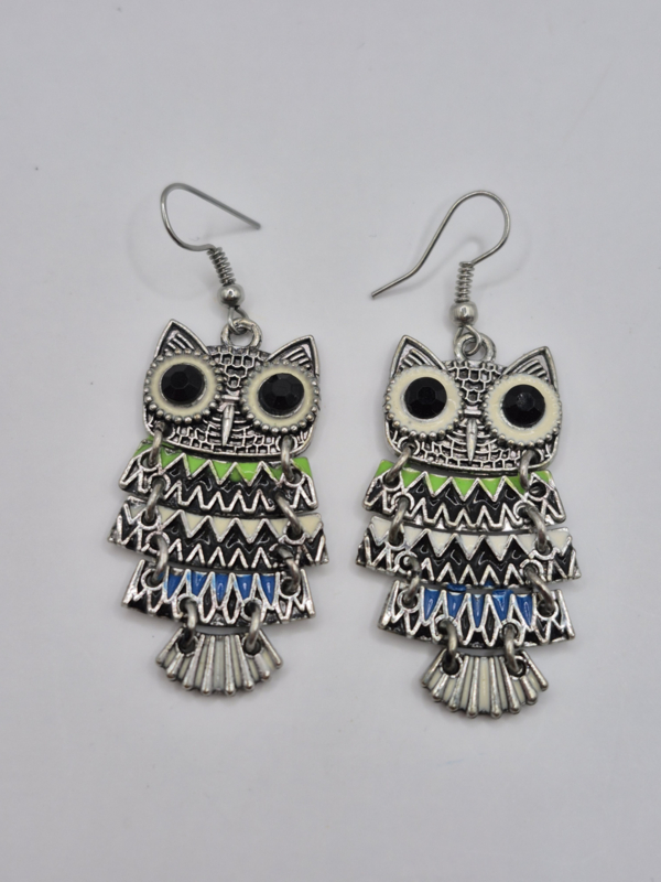 Oorhangers, uiltjesMateriaal: zilverkleurig metaal, glassteentje, emaille