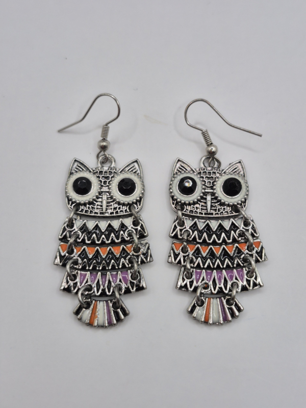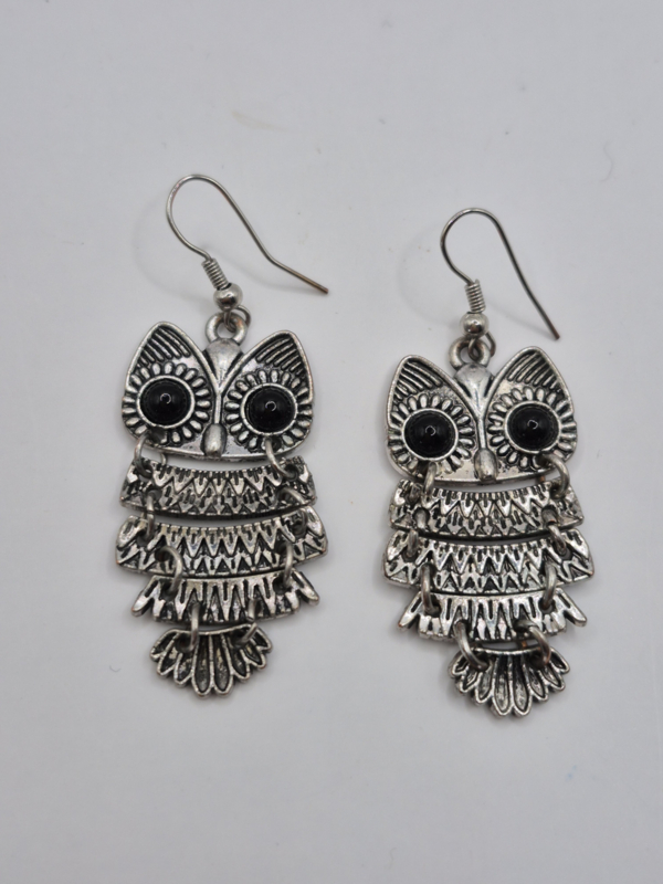 Oorhangers, uiltjesMateriaal: zilverkleurig metaal, zwart glassteentje, emaille